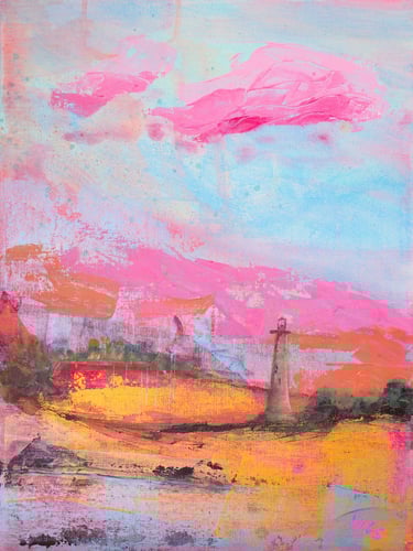 Rachel lives at the foot of the South Downs, just a brief walk to iconic places such as Beachy Head, Birling Gap and the Cuckmere Haven with its view of the Seven Sisters cliffs. Rachel has explored painting this view many times, capturing its beauty in stripped back simple cliffs, or the sunset when the soft warm light reflects best off the chalk faces. These paintings can be viewed in her Seven Sisters Collection.