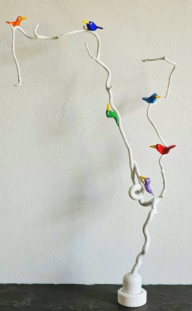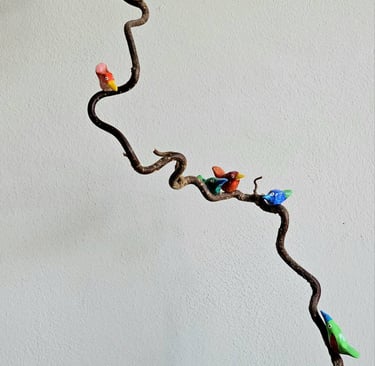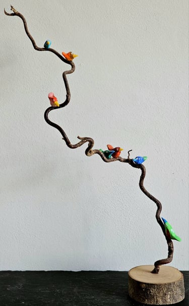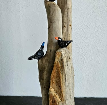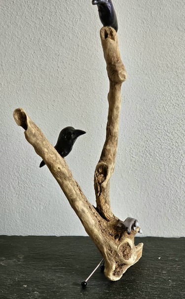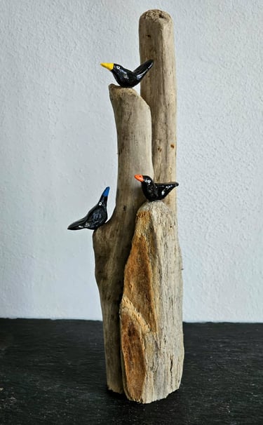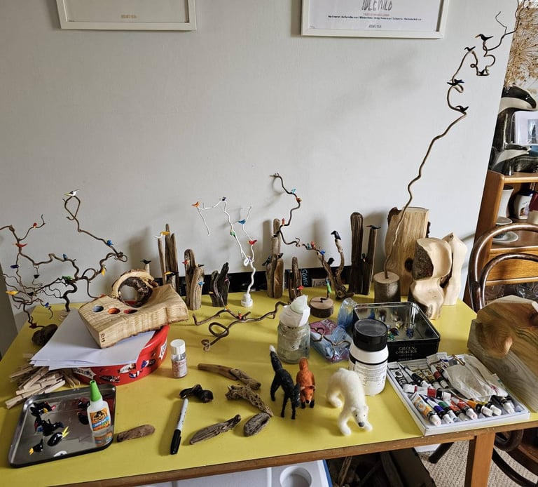 I'm not very good at doing nothing. My mind wanders and my hands like to make things. I'm fascinated by wood. Driftwood, interesting twigs and logs all end up back at my home and become things my mind and hands decide they should be. Small bits are homes for Quentin Blake inspired birds and large pieces become Barbra Hepworth / David Nash inspired book shelf sculpture which are as much to touch as to look at. In the winter I also like to make felt characters, often penguins but occasionally other things appear.